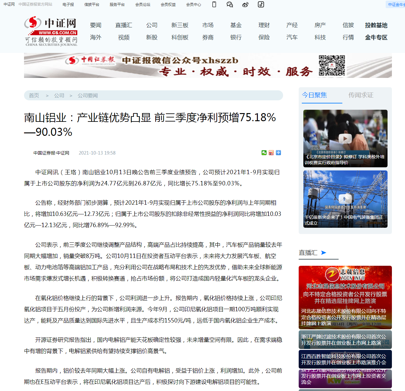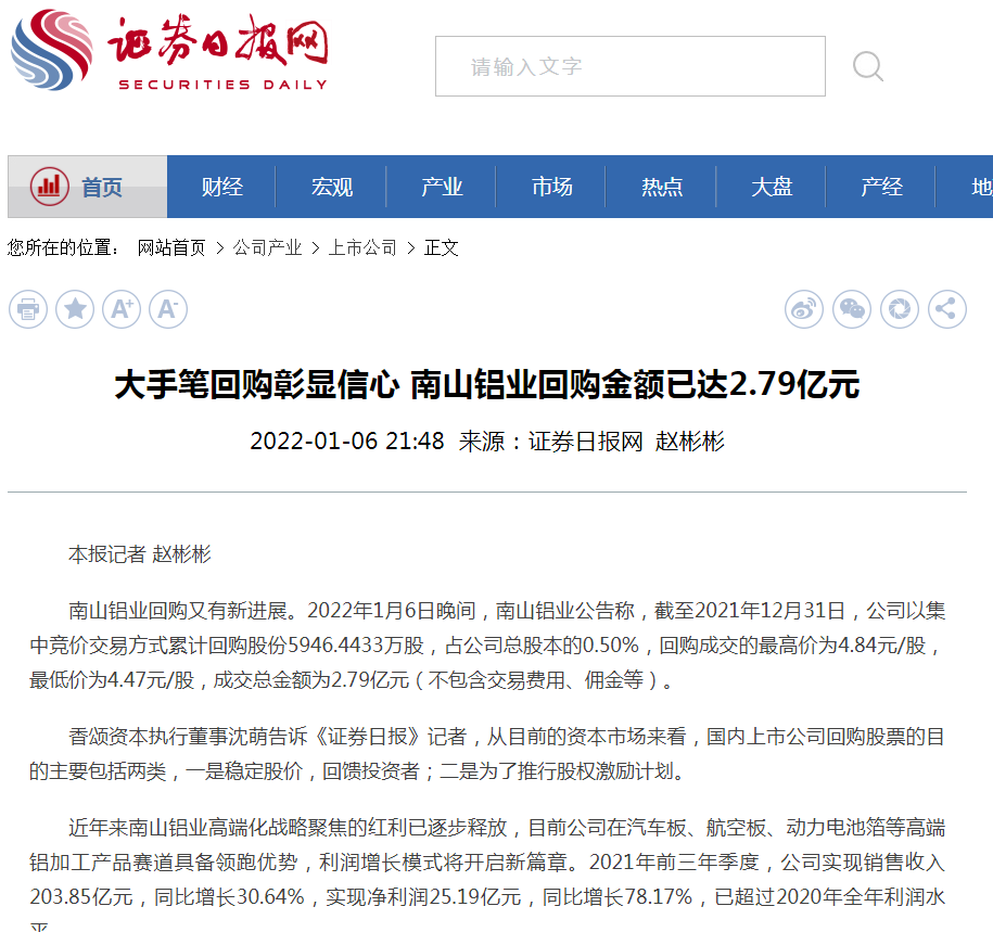 證券日報:大手筆回購彰顯信心 南山鋁業(yè)回購金額已達2.79億元