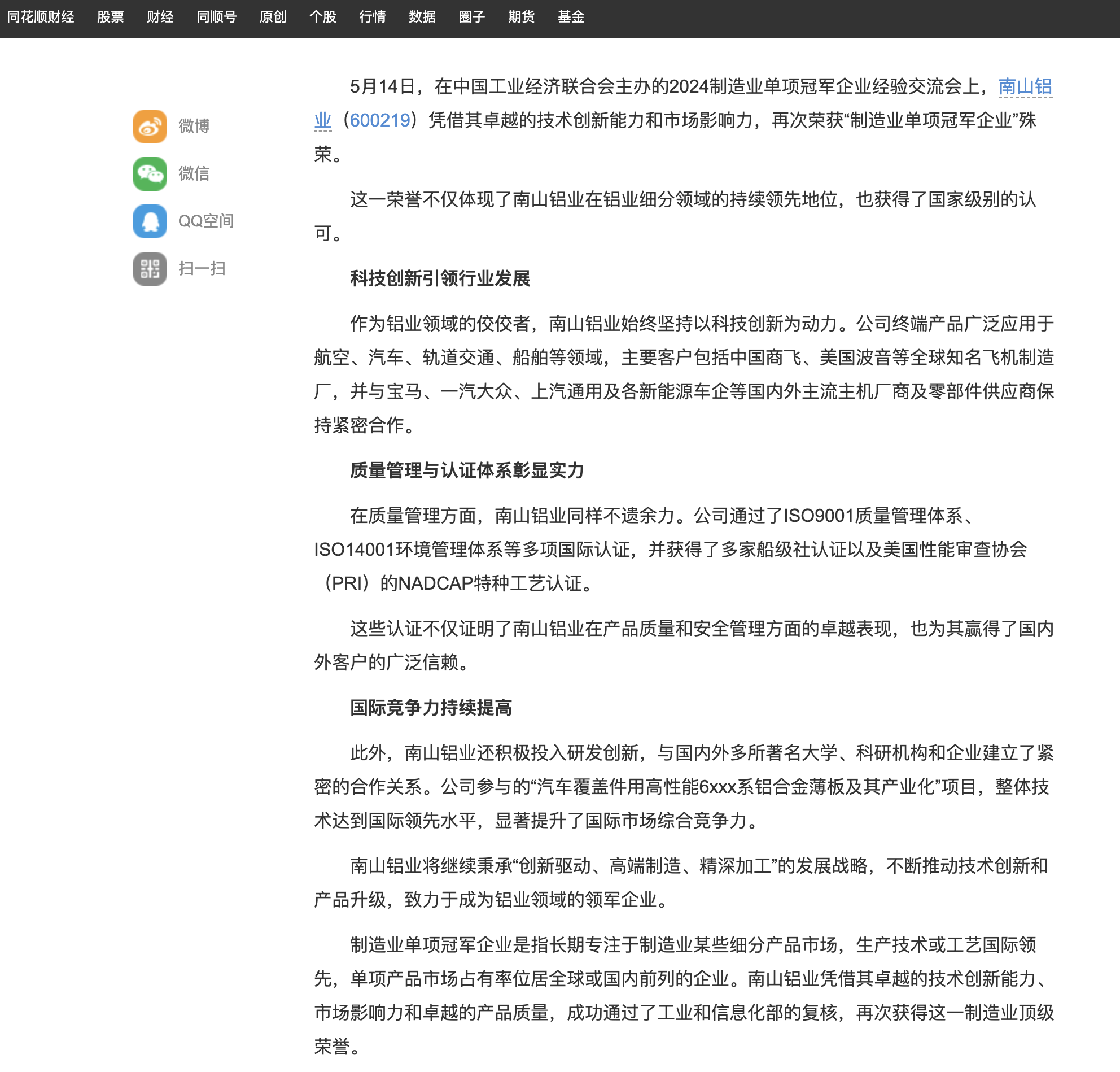 同花順財(cái)經(jīng):南山鋁業(yè)再獲制造業(yè)單項(xiàng)冠軍企業(yè)殊榮