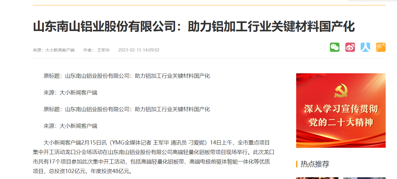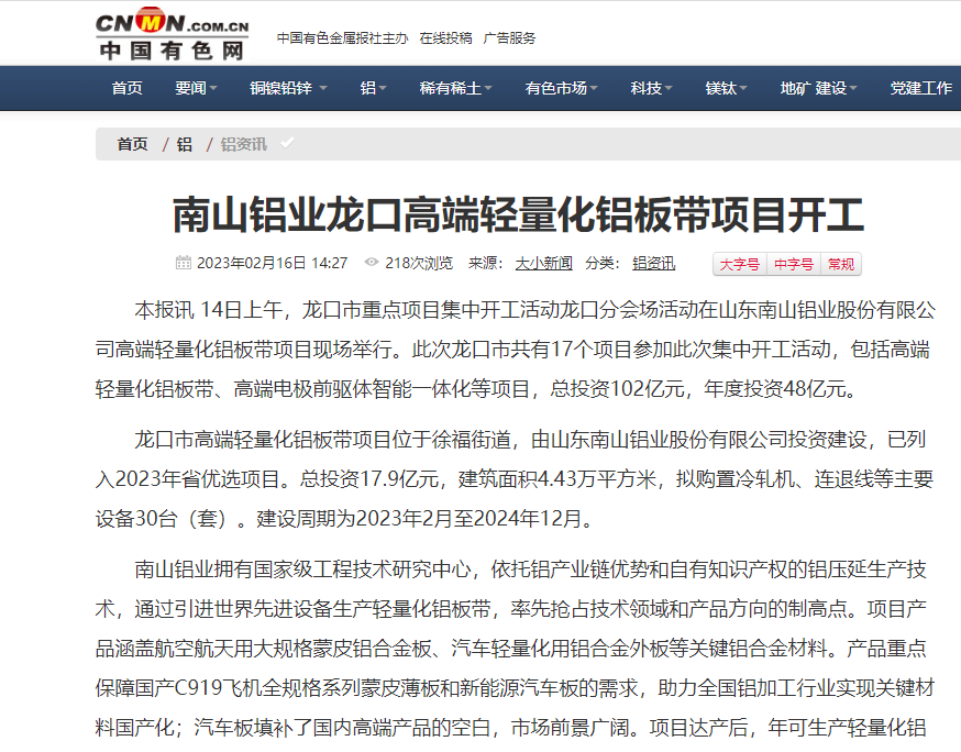 中國有色金屬網(wǎng):南山鋁業(yè)龍口高端輕量化鋁板帶項目開工
